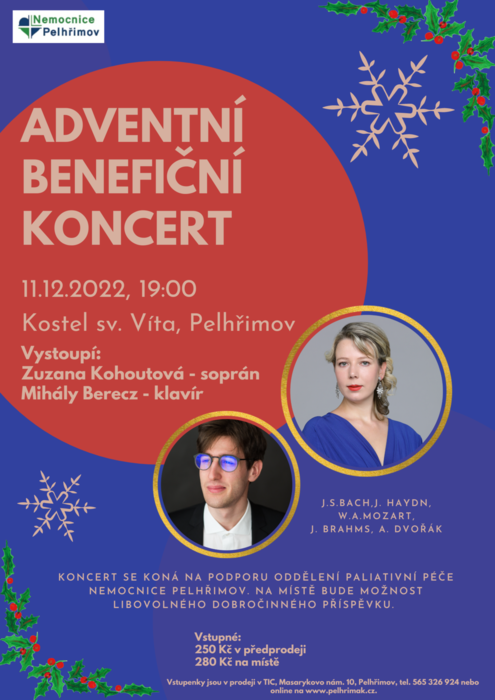 Uznávaná sopranistka Zuzana Kohoutová ve spolupráci s Nemocnicí Pelhřimov zve širokou veřejnost na Adventní benefiční koncert, který se uskuteční 11.12.2022 v 19 hodin v Kostele sv. Víta v Pelhřimově. Předvánoční koncert se koná na podporu Oddělení paliativní péče Nemocnice Pelhřimov. „Výtěžek bude použit na nákup zdravotnické techniky a pomůcek jako jsou koncentrátory kyslíku nebo elektricky polohovatelná lůžka. Dle výše výtěžku bude případně pořízen nový vůz,“ sdělila Tereza Mašková z oddělení paliativní péče s tím, že na místě bude možnost libovolného dobročinného příspěvku.