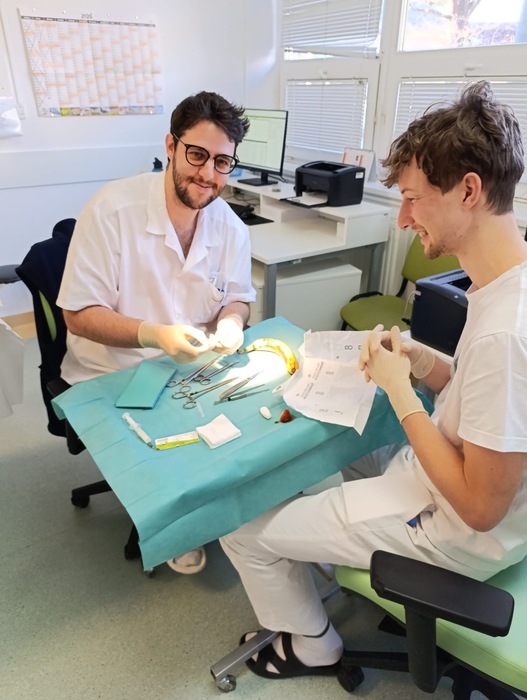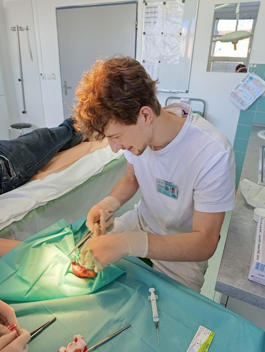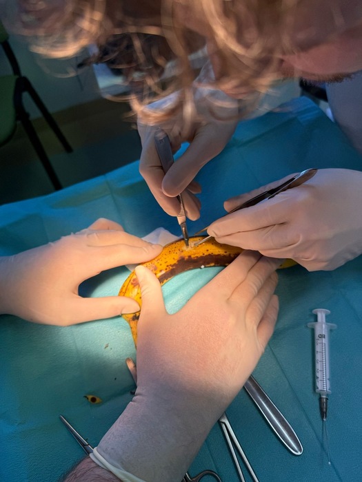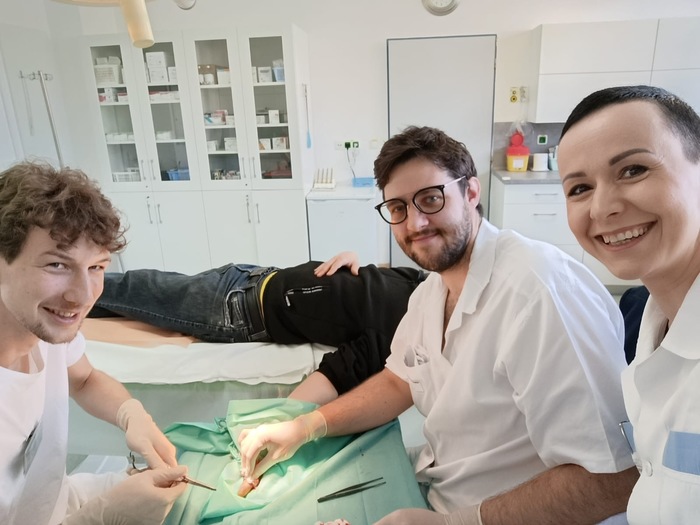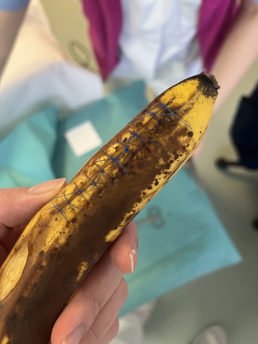 Chirurgická ambulance pelhřimovské nemocnice je místem, kde si budoucí lékaři mohou vyzkoušet své první kroky v oboru. Stážista Šimon Rásocha, student 5. ročníku 3.LF UK, který v Nemocnici Pelhřimov absolvoval týdenní povinnou stáž, měl možnost nahlédnout pod ruce zkušeným chirurgům a aktivně asistovat při drobných zákrocích. Kromě toho si pod dohledem zkušených lékařů vyzkoušel i první stehy – zatím na banánu, což je běžná výuková metoda v chirurgii. „Každý chirurg musí někde začít. Dát budoucím lékařům možnost vidět reálnou praxi a vyzkoušet si základní dovednosti považujeme za důležitou součást jejich vzdělávání,“ říká Luboš Havetta, primář chirurgického oddělení pelhřimovské nemocnice.