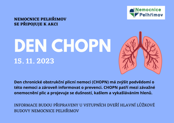 Nemocnice Pelhřimov se 15. listopadu připojila k Světovému dni CHOPN – chronické obstrukční plicní nemoci. CHOPN patří mezi závažné onemocnění plic a projevuje se dušností, kašlem a vykašláváním hlenů. Informace o prevenci byly pro zájemce připraveny u vstupních dveří hlavní lůžkové budovy pelhřimovské nemocnice.