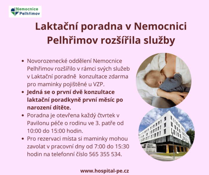Novorozenecké oddělení Nemocnice Pelhřimov rozšířilo v rámci svých služeb v Laktační poradně konzultace zdarma pro maminky pojištěné u VZP. Poradna je otevřena každý čtvrtek v Pavilonu péče o rodinu ve 3. patře od 10:00 do 15:00 hodin. Pro rezervaci místa si maminky mohou zavolat v pracovní dny od 7:00 do 15:30 hodin na telefonní číslo 565 355 534.