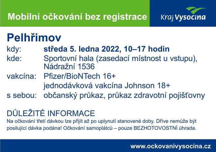 Ve středu 5. ledna bude v Pelhřimově možné očkování bez registrace. Mobilní tým přijede do sportovní haly, kde bude přítomen od 10 - 17 hodin. Aplikovány budou vakcíny: Pfizer/BioNTech 16+ (u osob mladších 18 let je nutný doprovod zákonného zástupce) a jednodávková vakcína Johnson 18+.