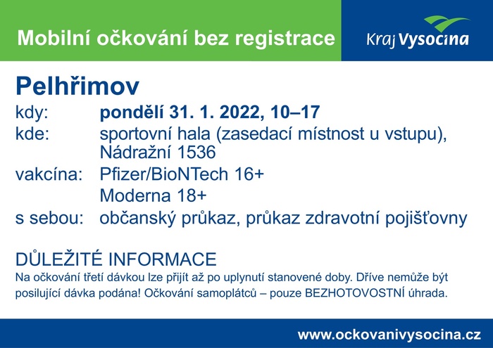 V pondělí 31. ledna je možné v Pelhřimově, ve Sportovní hale, Nádražní 1536 absolvovat očkování bez registrace. Očkovat se bude pro veřejnost v době od 10 - 17 hodin vakcínami Moderna pro osoby starší 18 let a Pfizer/BioNTech pro osoby starší 16 let. Nezapomeňte si s sebou vzít občanský průkaz a průkaz zdravotní pojišťovny.