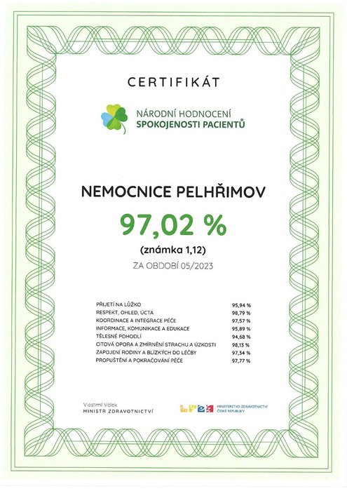 Nemocnice Pelhřimov se už podruhé zapojila do projektu Ministerstva zdravotnictví ČR s názvem Národní hodnocení spokojenosti pacientů. Dotazníkové šetření hospitalizovaných pacientů probíhalo v termínu od 1. 5. do 31. 5. 2023. Nemocnice Pelhřimov obdržela opět vynikající hodnocení. Svou spokojenost vyjádřilo 97,02 % pacientů, kteří se zapojili do projektu, a nemocnice tak od nich obdržela celkovou hodnoticí známku 1,12. Ve sledovaném období se pelhřimovská nemocnice umístila na 1. místě z 32 sledovaných zařízení. V porovnání s předchozím obdobím se jedná o 5,45 % (0,06 bodového) zlepšení.