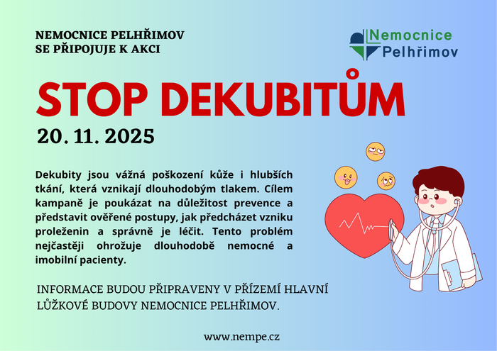 Nemocnice Pelhřimov se zapojila do kampaně Stop dekubitům, která upozorňuje na závažnost poškození kůže a hlubších tkání vznikajících důsledkem dlouhodobého tlaku. Tato problematika se nejčastěji týká dlouhodobě nemocných a imobilních pacientů, u nichž může mít vznik dekubitů zásadní dopad na jejich zdravotní stav i kvalitu života.