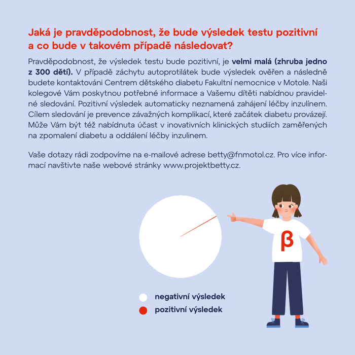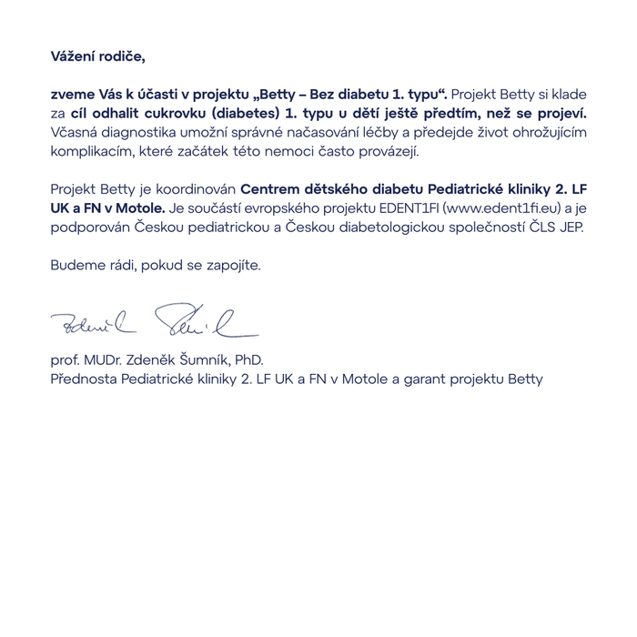 Diabetes 1. typu je autoimunitní onemocnění, při kterém imunitní systém napadá buňky produkující inzulin v pankreatu. Bez včasné diagnostiky a léčby může tento stav vést k vážným zdravotním problémům, jako jsou diabetická ketoacidóza, hyperglykémie až hyperglykemický hyperosmolární stav a postižení důležitých orgánů při chronicky špatné kompenzaci diabetu. Včasná diagnostika umožňuje nejen lepší kontrolu nad nemocí, ale také výrazně zlepšuje kvalitu života dětí a jejich rodin. „Jsme hrdí, že se můžeme připojit k Projektu Betty a přispět k prevenci a včasné léčbě cukrovky 1. typu u dětí. Naše spolupráce s tímto projektem je dalším krokem k zajištění lepší zdravotní péče pro naše malé pacienty. Rodiče získají potřebné informace a podporu, aby mohli lépe zvládat tuto chronickou nemoc,“ sdělil MUDr. Karel Medek, primář dětského oddělení pelhřimovské nemocnice.