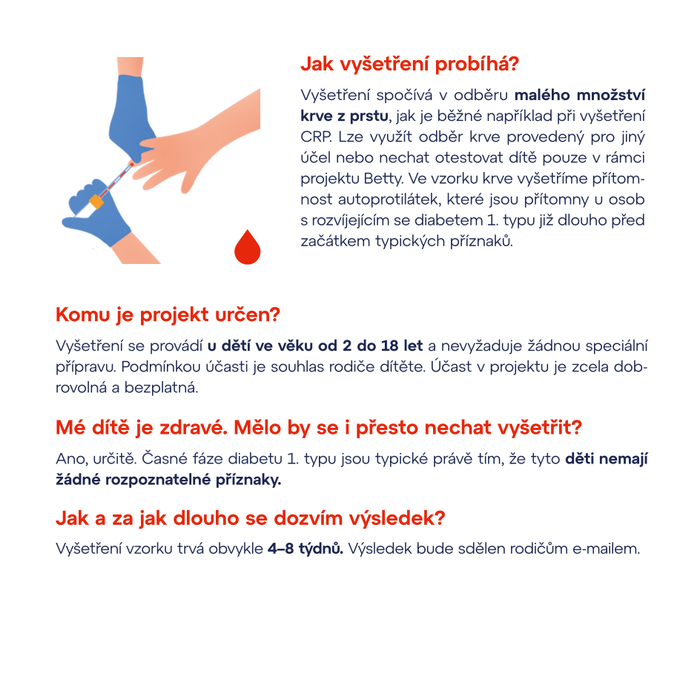 Projekt Betty je v České republice koordinován Centrem dětského diabetu Pediatrické kliniky 2. lékařské fakulty Univerzity Karlovy a Fakultní nemocnice v Motole a zároveň je součástí evropského projektu EDENT1FI a podporován Českou pediatrickou a Českou diabetologickou společností. Celkem bude otestováno 20 000 českých dětí. V rámci mezinárodního projektu probíhají screeningy v České republice, Dánsku, Německu, Itálii, Polsku, Portugalsku, Švédsku a Velké Británii.