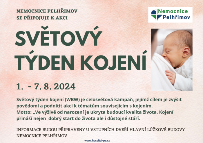 Nemocnice Pelhřimov se připojila ke Světovému týdnu kojení, který probíhá od 1. do 7. srpna 2024. Tato mezinárodní iniciativa má za cíl zvýšit povědomí o důležitosti kojení a podpořit matky v této přirozené a zdravé formě výživy pro jejich děti. Pro zájemce jsou připraveny informace, které jsou umístěny v přízemí hlavní lůžkové budovy nemocnice. Informace zahrnují například výhody kojení pro dítě i matku, správné techniky kojení nebo rady a tipy pro překonání běžných problémů spojených s kojením.