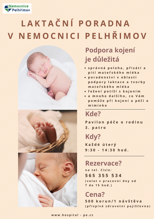 Nemocnice Pelhřimov také nabízí laktační poradnu, která je k dispozici ve třetím patře Pavilonu péče o rodinu, každé úterý v čase od 9:30 do 14:30 hodin. Laktační poradna poskytuje individuální konzultace a podporu pro matky, které potřebují pomoc s kojením. Pro rezervaci místa si maminky mohou zavolat v pracovní dny od 7:00 do 15:00 hodin na telefonní číslo 565 355 534.