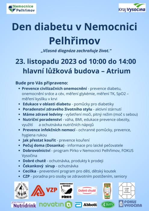 Nemocnice Pelhřimov ve spolupráci se Zdravým městem Pelhřimov zve veřejnost na Den diabetu, akci zaměřenou na důležitost prevence diabetu a civilizačních onemocnění. Tato událost se uskuteční ve čtvrtek 23. listopadu 2023 v Atriu hlavní lůžkové budovy Nemocnice Pelhřimov od 10:00 do 14:00 hodin. Cílem Dne diabetu je zvýšit povědomí veřejnosti o tomto onemocnění a poskytnout informace, které lidé mohou využít k ochraně svého zdraví. Návštěvníkům bude zdarma k dispozici měření zdravotních parametrů, jako je hodnota glykémie, krevního tlaku, kyslíku v krvi, množství tělesného tuku v těle nebo vyšetření moči. Dále nebudou chybět informace pro laické pečovatele nebo zájemce o dobrovolnictví v Nemocnici Pelhřimov.