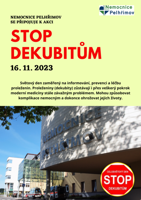 Nemocnice Pelhřimov se 16. listopadu zapojila ke světovému dni, který je zaměřený na informování, prevenci a léčbu proleženin (dekubitů). Proleženiny jsou, i přes veškerý pokrok moderní medicíny, vážnou zdravotní komplikací, a proto je důležité jim co nejúčinněji předcházet. Informace jsou připraveny u vstupních dveří hlavní lůžkové budovy nemocnice.