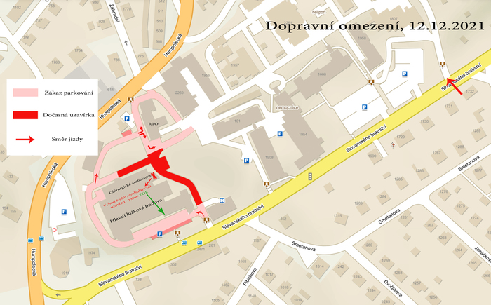 V souvislosti se stavebními pracemi na novém pavilonu dojde od neděle 12. 12. 2021 do neděle 19.12.2021 k uzavření úseku silnice vedoucí souběžně s hlavní lůžkovou budovou až před vchod k ortopedickým a chirurgickým ambulancím. V souvislosti s tímto omezením bude uzavřen boční vstup k chirurgickým, ortopedickým a odborným ambulancím umístněným v pavilonu akutní medicíny. Vstup k ambulancím bude možný přes hlavní vchod do nemocnice (krytý vstup - hlavní lůžková budova).