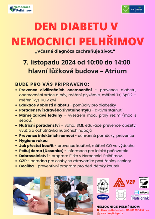 Nemocnice Pelhřimov ve spolupráci se Zdravým městem Pelhřimov zve všechny na Den diabetu, který se uskuteční ve čtvrtek 7. listopadu od 10:00 do 14:00 hodin v Atriu nemocnice. Přijďte se dozvědět více o diabetu, prevenci a správné péči o zdraví. Čeká Vás odborné poradenství a měření hladiny cukru v krvi, měření tlaku, vyšetření moči, edukace v oblasti správného životního stylu nebo preventivní programy pro děti.