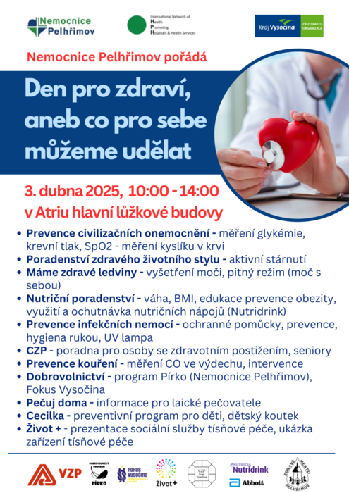 Nemocnice Pelhřimov ve spolupráci se Zdravým městem Pelhřimov Vás zve na 8. ročník Den pro zdraví, který se uskuteční 3. dubna 2025 od 10 do 14 hodin v atriu nemocnice. Cílem akce je upozornit na důležitost prevence civilizačních onemocnění, která mohou dlouho zůstávat bez příznaků, ale významně ovlivňují kvalitu života. „V průběhu akce si návštěvníci mohou nechat zdarma změřit krevní tlak, zjistit hladinu cukru v krvi a podstoupit vyšetření moči, které může pomoci odhalit skrytá onemocnění ledvin. K dispozici bude také nutriční poradenství, kde se zájemci dozví, jak správně pečovat o své zdraví prostřednictvím vyvážené stravy. Nebude chybět ani správný nácvik hygienického mytí rukou.