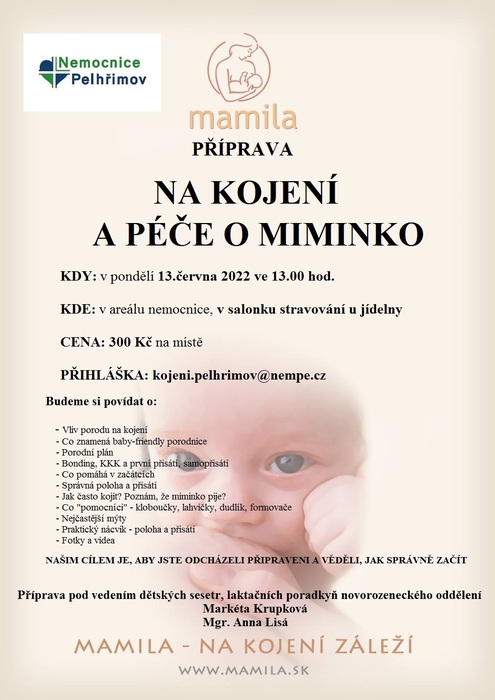 Na tyto a mnoho dalších otázek dostanou maminky odpověď už 13. června. V salonku stravovacího provozu (nachází se v těsné blízkosti jídelny) v areálu Nemocnice Pelhřimov začne ve 13 hodin přednáška s názvem Příprava na kojení a péče o miminko. Více informací naleznete v přiloženém plakátu.