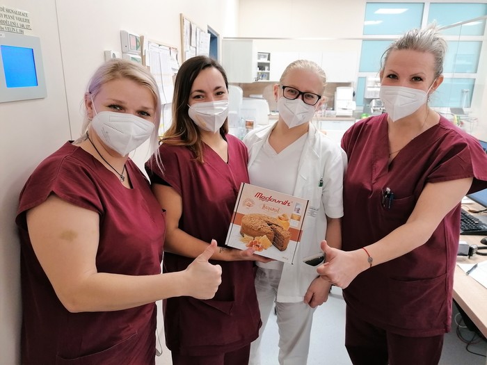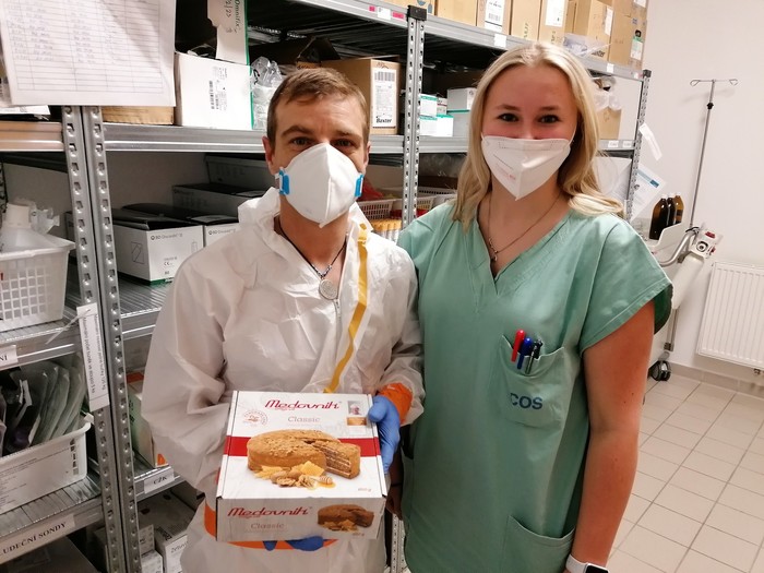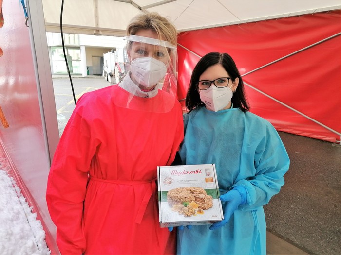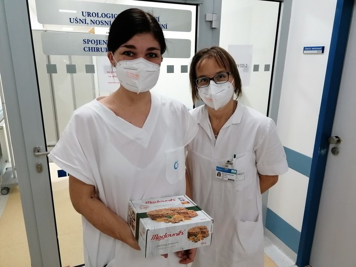 Děkujeme zaměstnankyním z přepážky pelhřimovské pobočky VZP, které věnovaly našim zaměstnancům na covidových odděleních, ARO, urgentním příjmu a personálu očkovacího centra a odběrového stanu šest kusů medovníků. Děkujeme, podpory si vážíme.