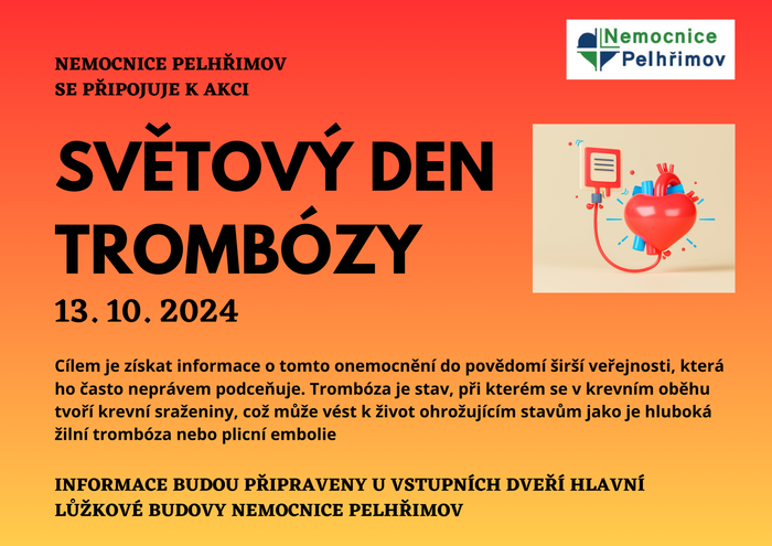 Nemocnice Pelhřimov se připojuje ke Světovému dni trombózy, který připadá na 13. října. Tento den připomíná důležitost prevence a včasného rozpoznání tohoto nebezpečného onemocnění. Ve vstupní části hlavní lůžkové budovy Nemocnice Pelhřimov jsou připraveny informační materiály, které Vám mohou pomoci rozšířit povědomí o rizikových faktorech, příznacích a možnostech prevence trombózy. Přijďte se informovat a dozvědět více o tom, jak chránit své zdraví.