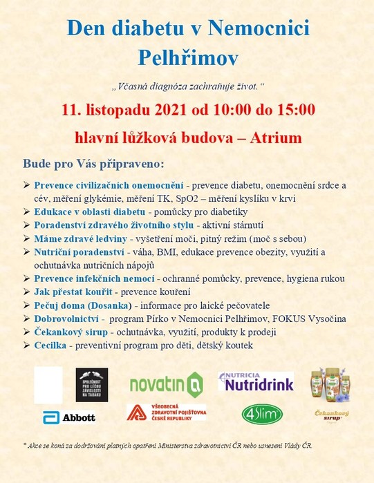 Nemocnice Pelhřimov ve spolupráci se Zdravým městem Pelhřimov pořádá akci Den diabetu. Hlavním cílem je zdůraznit prevenci nejen diabetu, ale i všech civilizačních onemocnění. Ukázat, že zdravý životní styl a pravidelná pohybová aktivita by měla být nedílnou součástí každého z nás.