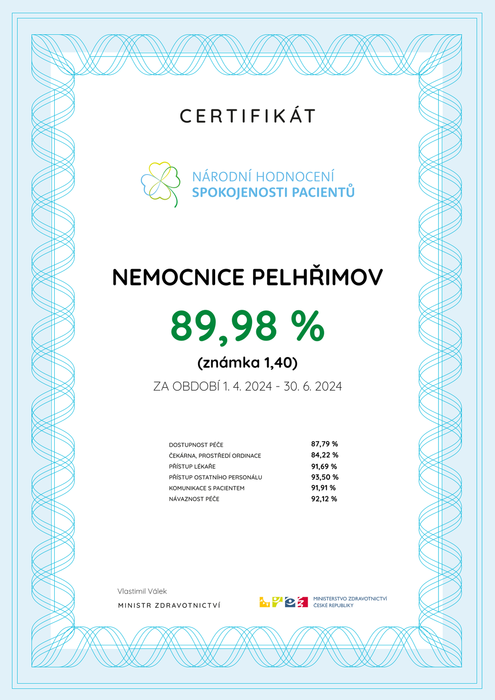 Nemocnice Pelhřimov dosáhla v Národním hodnocení spokojenosti ambulantních pacientů Ministerstva zdravotnictví ČR za II. čtvrtletí roku 2024 (1. 4. 2024 – 30. 6. 2024) výborného výsledku. Hodnocení, provedené ve 23 ambulancích nemocnice, zahrnovalo např. urologii, chirurgii, ortopedii či pediatrii, a pacienti měli možnost hodnotit péči pomocí dotazníků dostupných přes QR kód. Celkem bylo odevzdáno 346 dotazníků. Pacienti v nich hodnotili například dostupnost péče, prostředí ordinace, přístup lékaře a ostatního personálu či komunikaci s pacientem.
