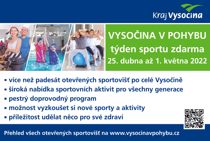 Na Vysočině v pondělí 25. dubna začal týden sportu zdarma. V rámci akce Vysočina v pohybu si lidé mohou přijít bezplatně zasportovat na desítky míst ve svém okolí. Akce trvá až do neděle 1. května 2022 a seznam zapojených sportovišť je k dispozici na speciálním webu vysocinavpohybu.cz. „Společně s partnery chceme veřejnosti umožnit vyzkoušet si nové sporty, které ji nadchnou a přesvědčí k pravidelnému provozování. Týden sportu zdarma je ideální příležitostí, jak udělat něco pro své zdraví, inspirací k trávení volného času a také způsobem, jak shodit přebytečná kila,“ vyjmenovává hejtman Kraje Vysočina Vítězslav Schrek.