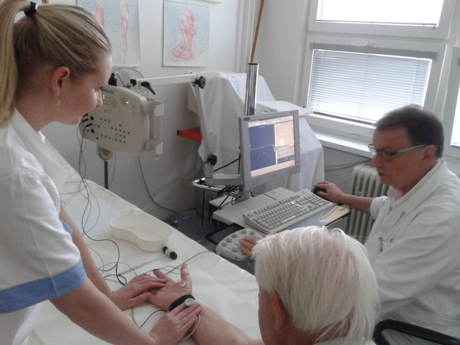 Jako druhá část vyšetření se provádí elektromyografie jehlová. Jehlová elektroda se zavede do příslušného svalu vpichem. Této metody se není také třeba obávat, jelikož elektrody jsou velmi tenké, tenčí než běžné injekční stříkačky. Častými návštěvníky naší laboratoře jsou lidé s brněním prstů, tedy pacienti s nemocí zvanou syndrom karpálního tunelu. Tyto potíže jsou způsobeny útlakem středního nervu vazem v okolí zápěstí. Po ukončení vyšetření Vám bude předán výsledek a zpráva pro ošetřujícího lékaře, kde jsou uvedeny jednotlivé parametry provedeného měření a celkové shrnutí nálezu ve vztahu ke klinickým obtížím.